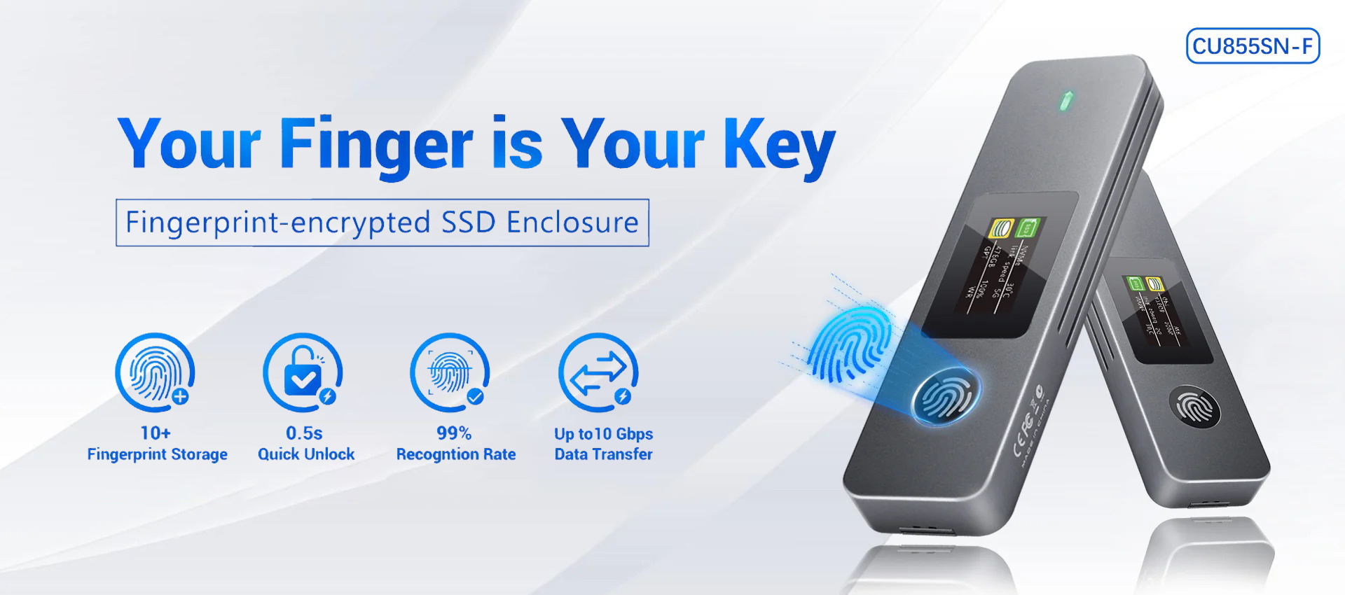 VCOM Fingerprint Encrypted SSD Enclosure - USB 3.2 10Gbps M.2 NVMe/SATA Adapter - Secure Portable External Hard Drive Case for Data Privacy